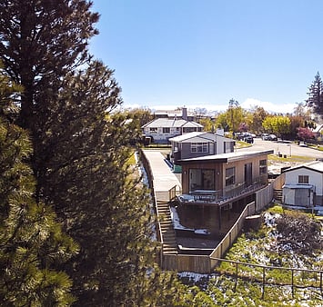 Outdoor Space: Features an expansive deck with outdoor seating, positioned to capture the magnificent lake and mountain views.